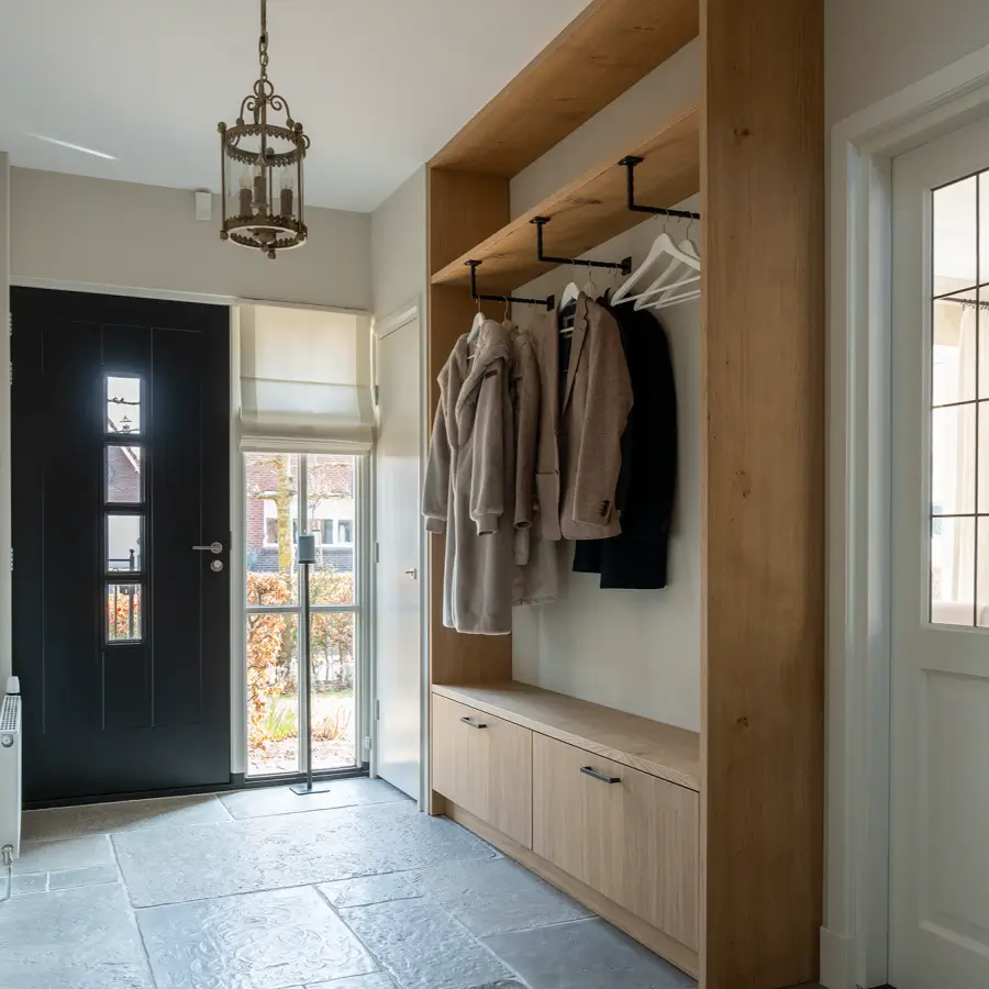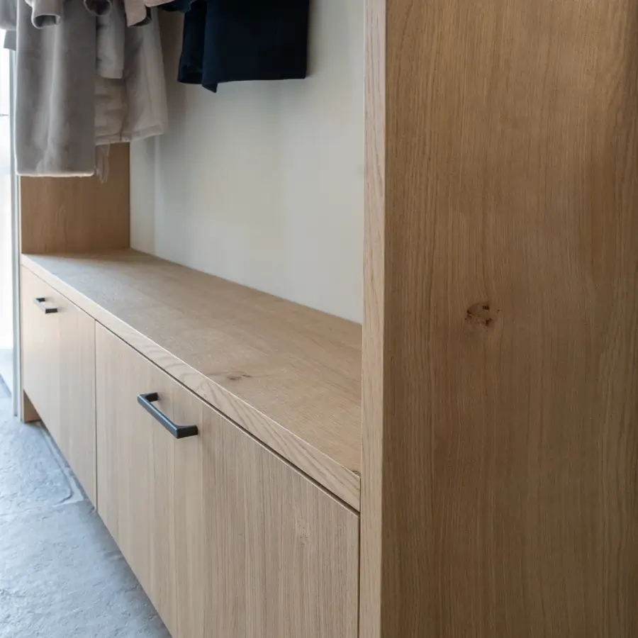 In de hal zorgt een bijpassende garderobekast, uitgevoerd in hetzelfde eikenfineer, voor een warme, stijlvolle overgang. Deze kast biedt volop opbergruimte en draagt bij aan een rustgevende entree.