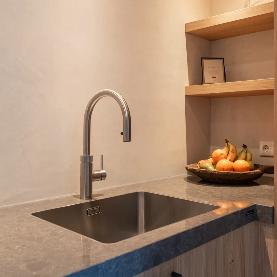 Ook de koffienis is volledig in stijl, met drie laden, een werkblad en twee houten schappen – praktisch én een mooie plek om servies te tonen. Materiaal, kleur en indeling vormen een harmonieus geheel.