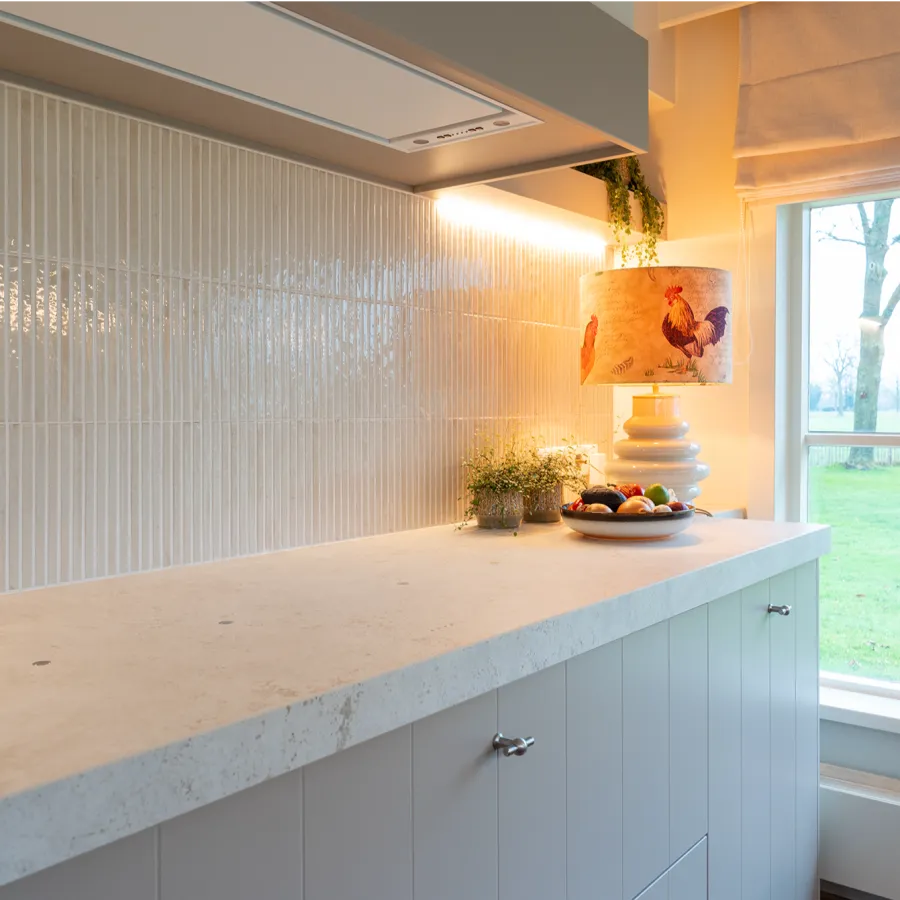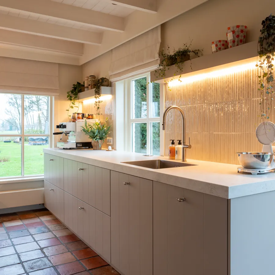 Het resultaat is een rustige, stijlvolle keuken waarin landelijk wonen en moderne techniek perfect samenkomen.