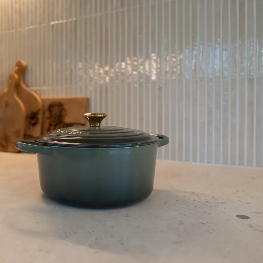 In het ontwerp is zorgvuldig rekening gehouden met de karakteristieke tegels op de vloer, die de keuken een landelijke basis geven. Daarboven zorgen de Magic grijs fluweellak fronten voor een moderne en zachte uitstraling. In combinatie met de subtiele RVS knoppen ontstaat een stijlvol en evenwichtig geheel.