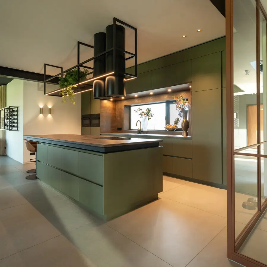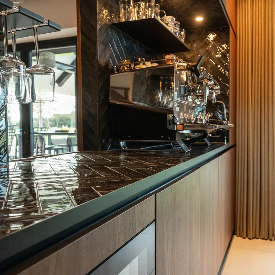 Deze keuken is van alle gemakken voorzien: een wijnkoelkast houdt jouw favoriete flessen op de ideale temperatuur, en een praktische pantry zorgt niet alleen voor heerlijke verse koffie maar ook voor extra opbergruimte.
