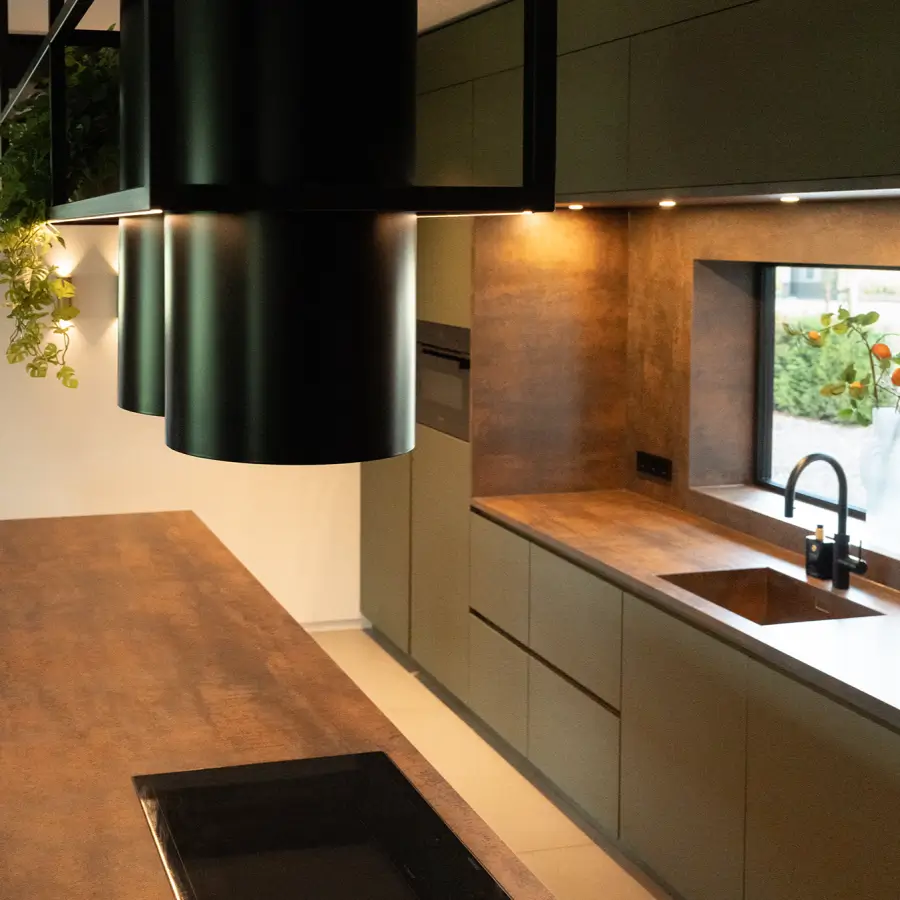 Vakmanschap met eigentijds design wordt in deze keuken gecombineerd. Het matte, keramische werkblad is uitgevoerd in de kleur virtual brown. Een verlichte nis, bekleed met hetzelfde hoogwaardige keramiek, zorgt voor een sfeervol accent. Het ruime kookeiland met bar zorgt voor sfeer in deze woonkeuken.