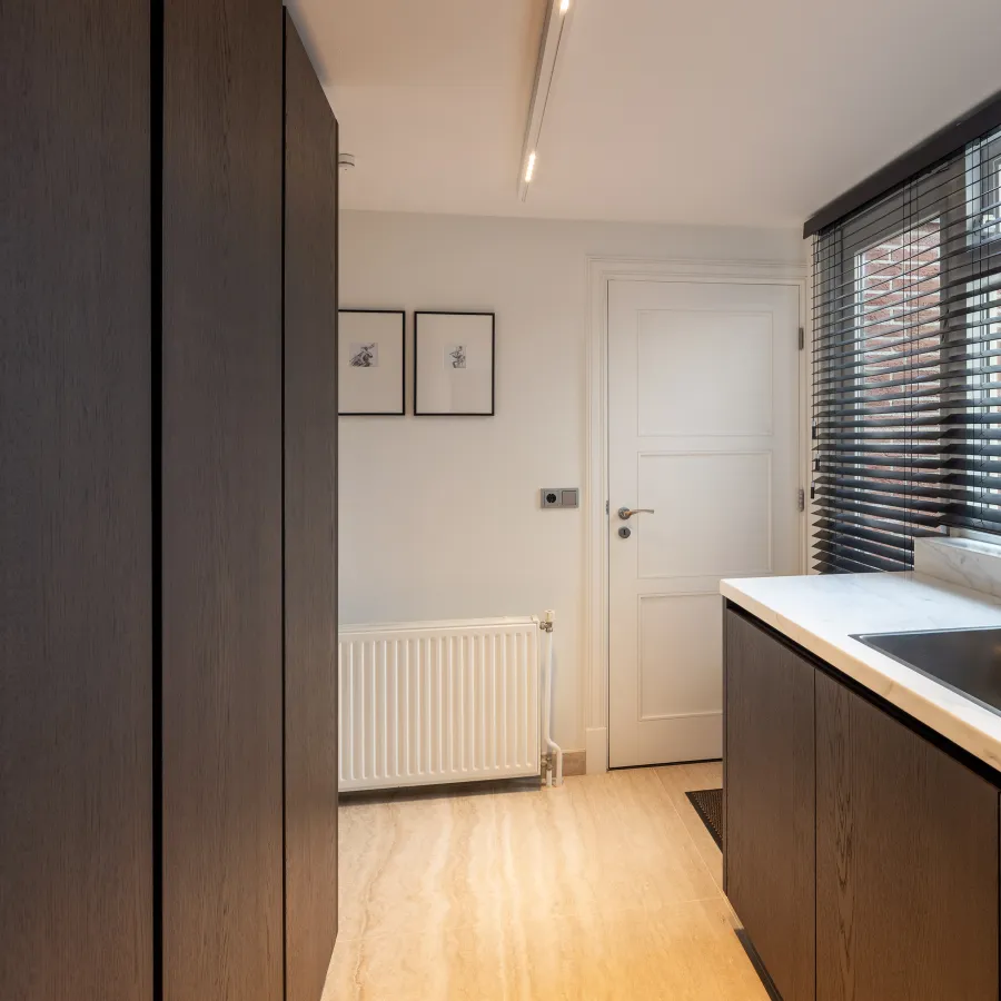 De bijkeuken is uitgevoerd in hetzelfde hoogwaardige eikenfineer en uitgerust met een extra koelkast en vriezer. Zo vormt deze een praktische én smaakvolle uitbreiding van de keuken.