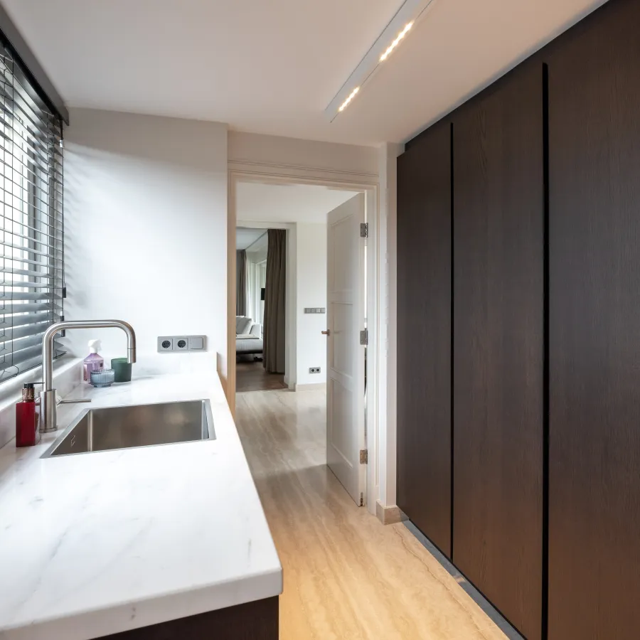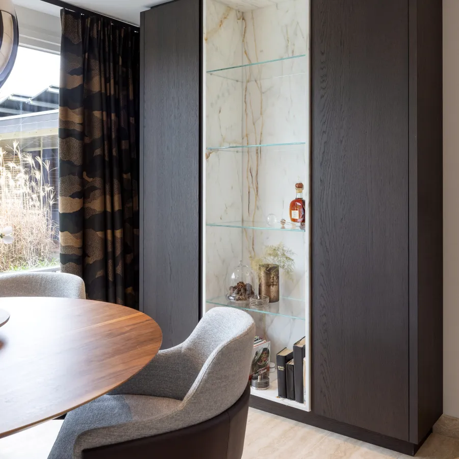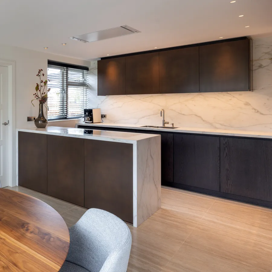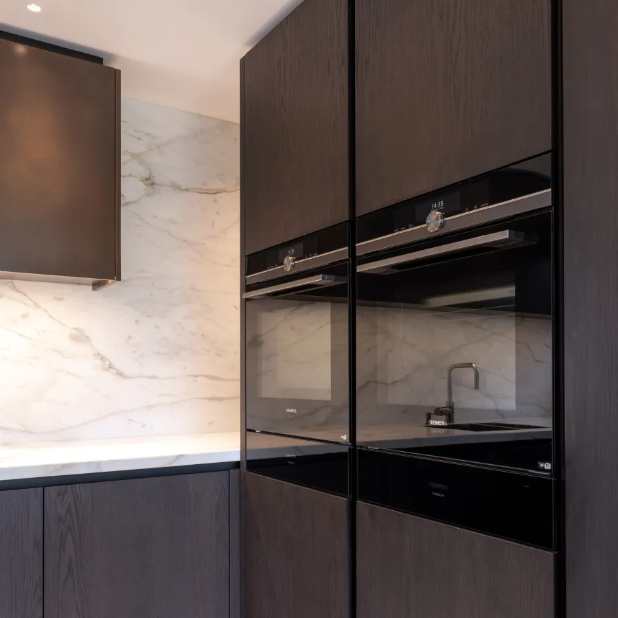Het werkblad is uitgevoerd in gezoet Bianco Carrara-marmer, waarin de kookplaat subtiel is in gefreesd voor een strak en naadloos geheel. De marmeren achterwanden zijn volledig in boekwerk gemonteerd: twee spiegelbeeldige marmerplaten die samen een verbluffend symmetrisch patroon vormen en een indrukwekkend visueel effect creëren.