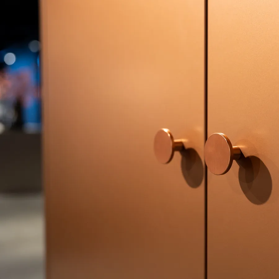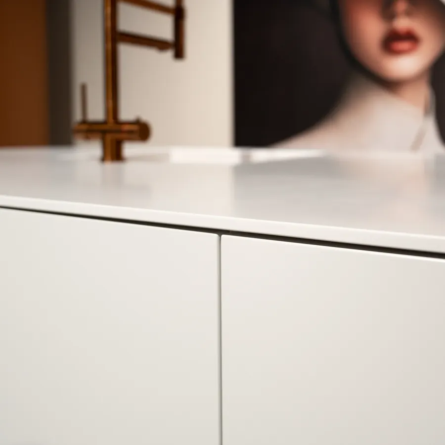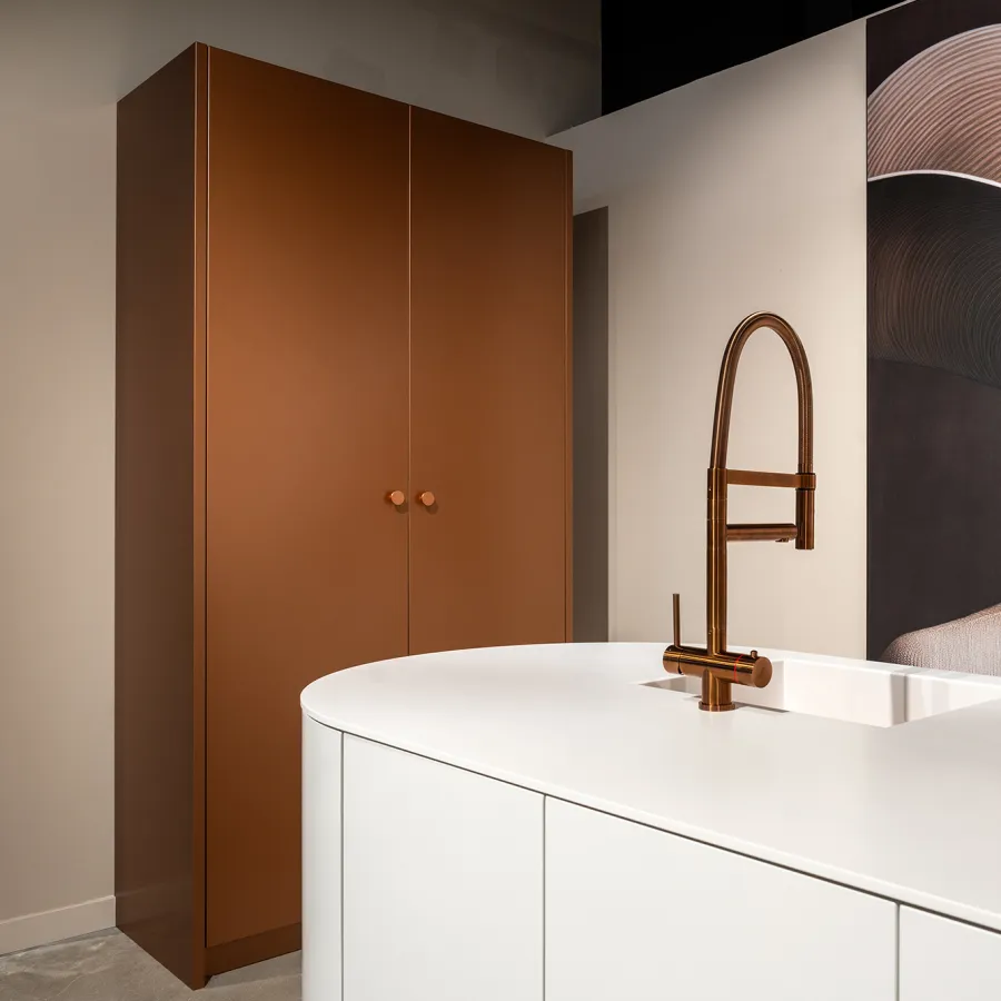 De warme glans van de koperen kasten en bijpassende grepen brengt diepte en karakter in het geheel. Samen vormen wit en koper een verfijnd contrast: fris en modern, maar met een subtiele luxe die nooit uit de tijd raakt.