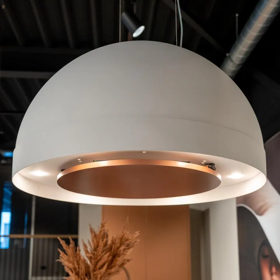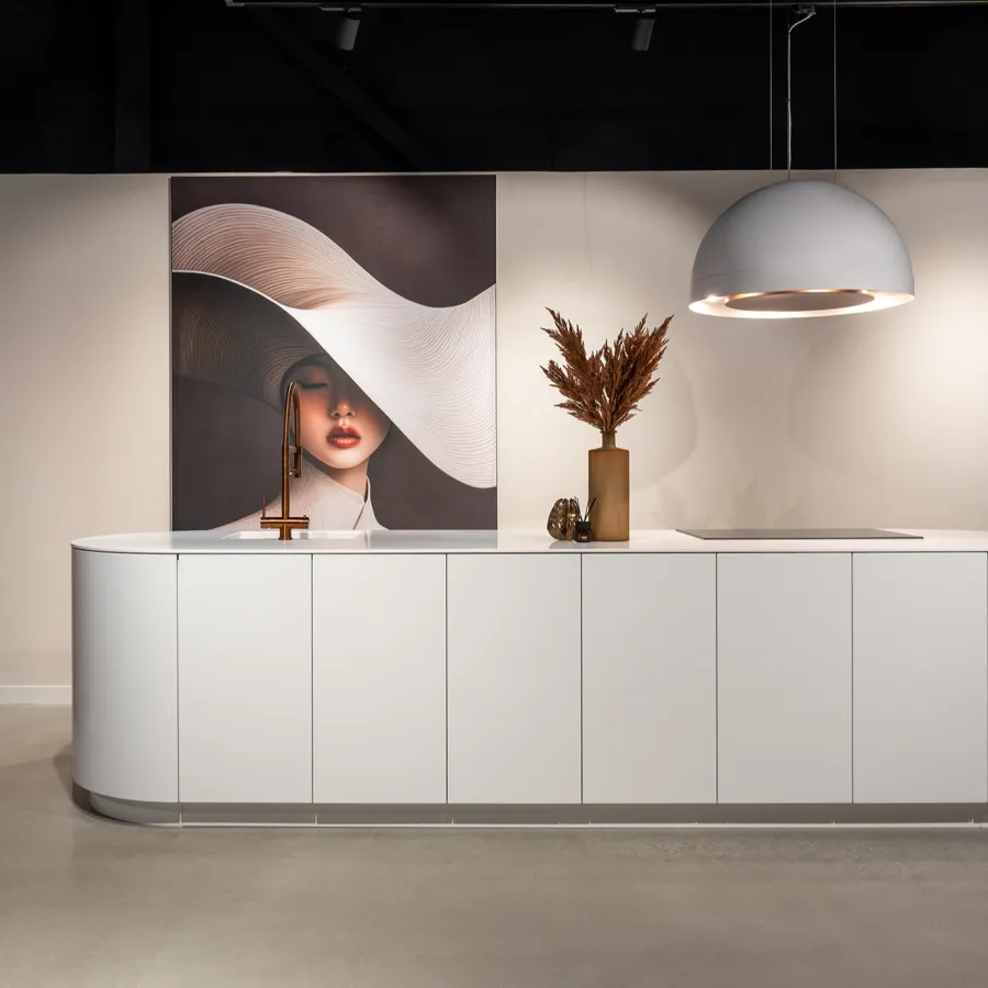 Het werkblad is gemaakt van hoogwaardig Corian en volledig naadloos gelegd – zonder zichtbare koppelnaden – voor een perfect egale en hygiënische uitstraling. Boven het eiland hangt een afzuigkap in de vorm van een lamp, uitgevoerd in het iconische Wave design, die elegantie en functionaliteit combineert.