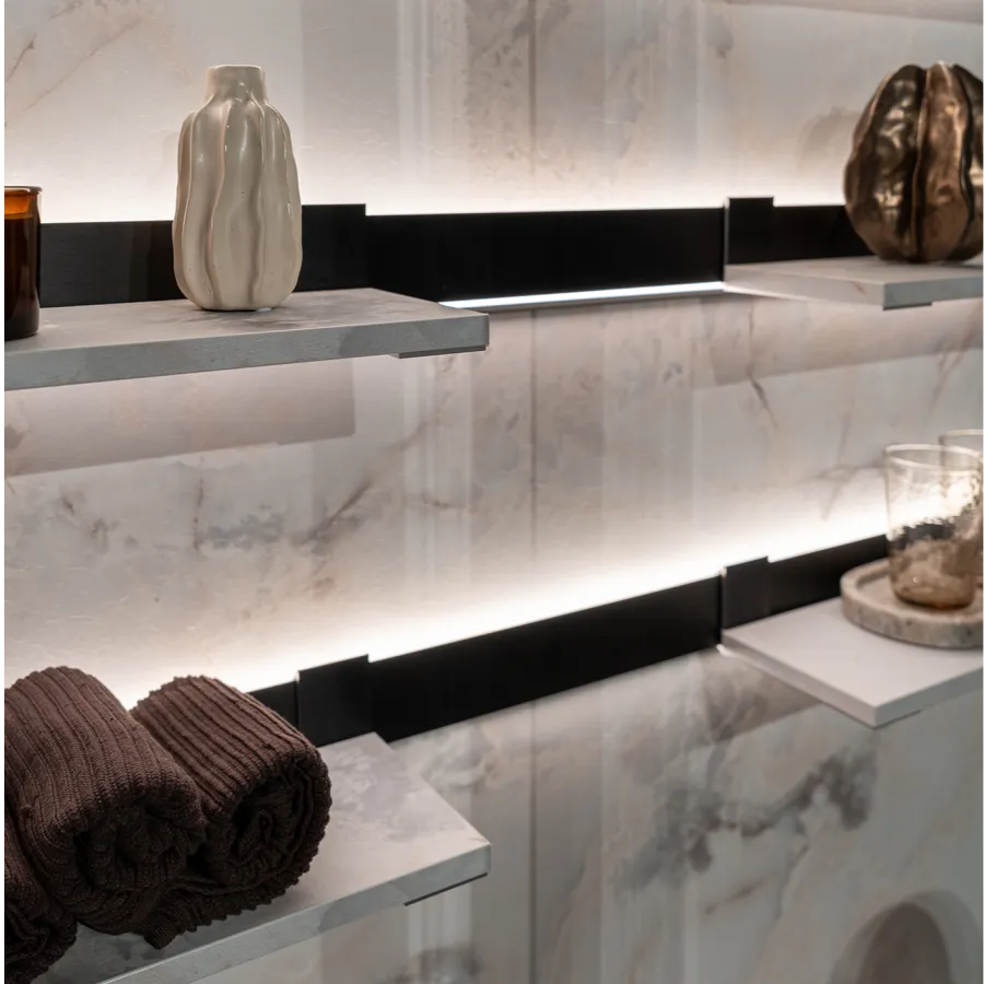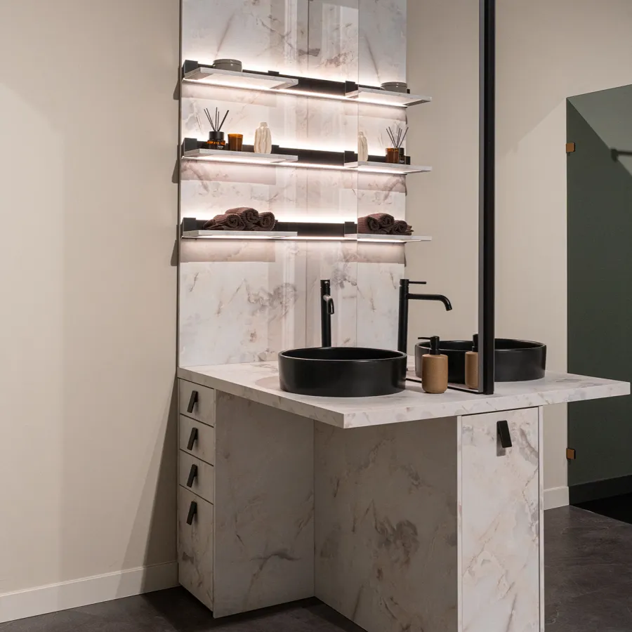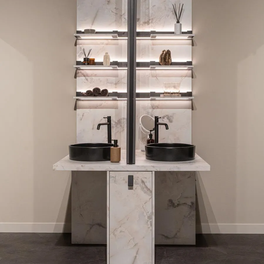 Dit wasmeubel is uitgevoerd in een marmerlook, gecombineerd met zwarte accenten. De dubbele waskommen en slanke kranen geven het geheel een hoteluitstraling, terwijl de open vakken met geïntegreerde LED-verlichting zorgen voor een warme en sfeervolle ambiance. Ideaal voor het stijlvol opbergen en presenteren van uw badkameraccessoires.