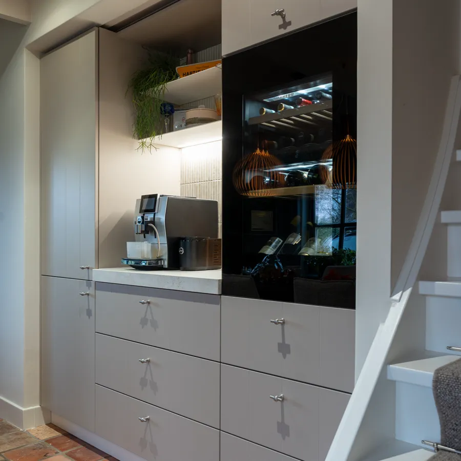 Het Dekton werkblad voegt luxe en duurzaamheid toe, met een natuurlijke steenlook die mooi aansluit bij de omgeving. De keuken is uitgerust met hoogwaardige inbouwapparatuur, waaronder een Liebherr wijnklimaatkast Vinidor, een Bora stoomoven en een strak geïntegreerde Novy Induction Undercover. Deze inductiekookplaat is volledig onzichtbaar onder het werkblad geplaatst, waardoor het werkblad strak en naadloos blijft.