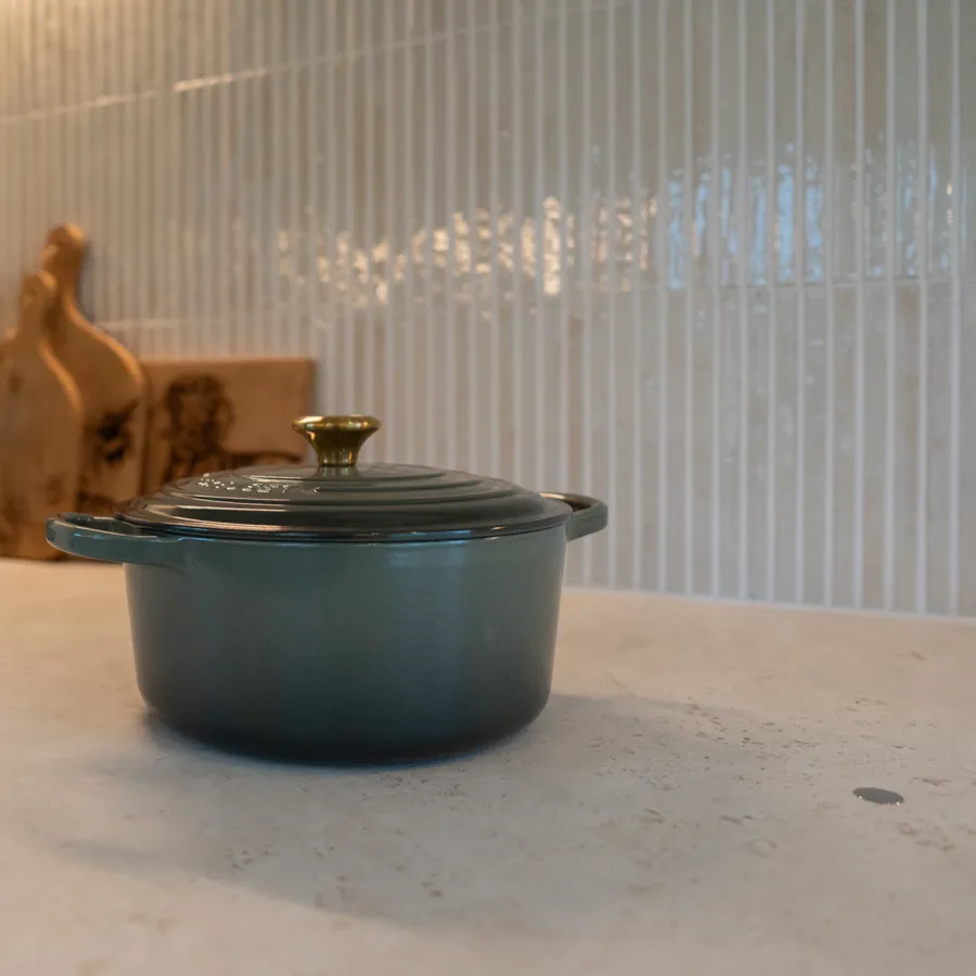 In het ontwerp is zorgvuldig rekening gehouden met de karakteristieke tegels op de vloer, die de keuken een landelijke basis geven. Daarboven zorgen de Magic grijs fluweellak fronten voor een moderne en zachte uitstraling. In combinatie met de subtiele RVS knoppen ontstaat een stijlvol en evenwichtig geheel.