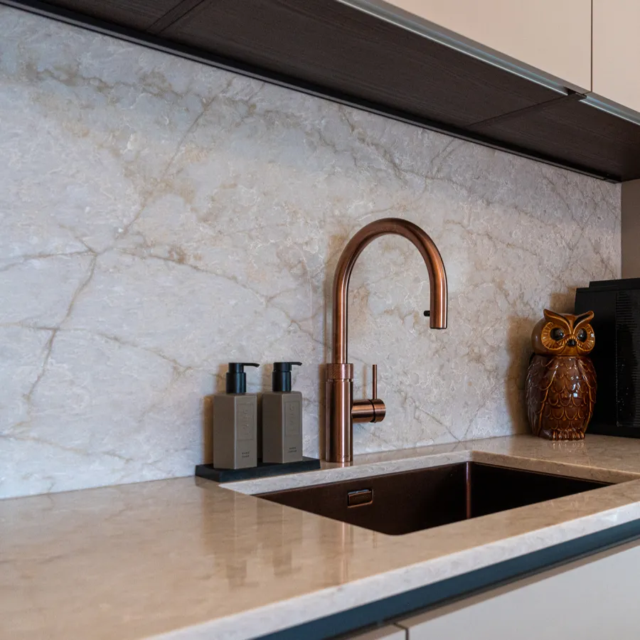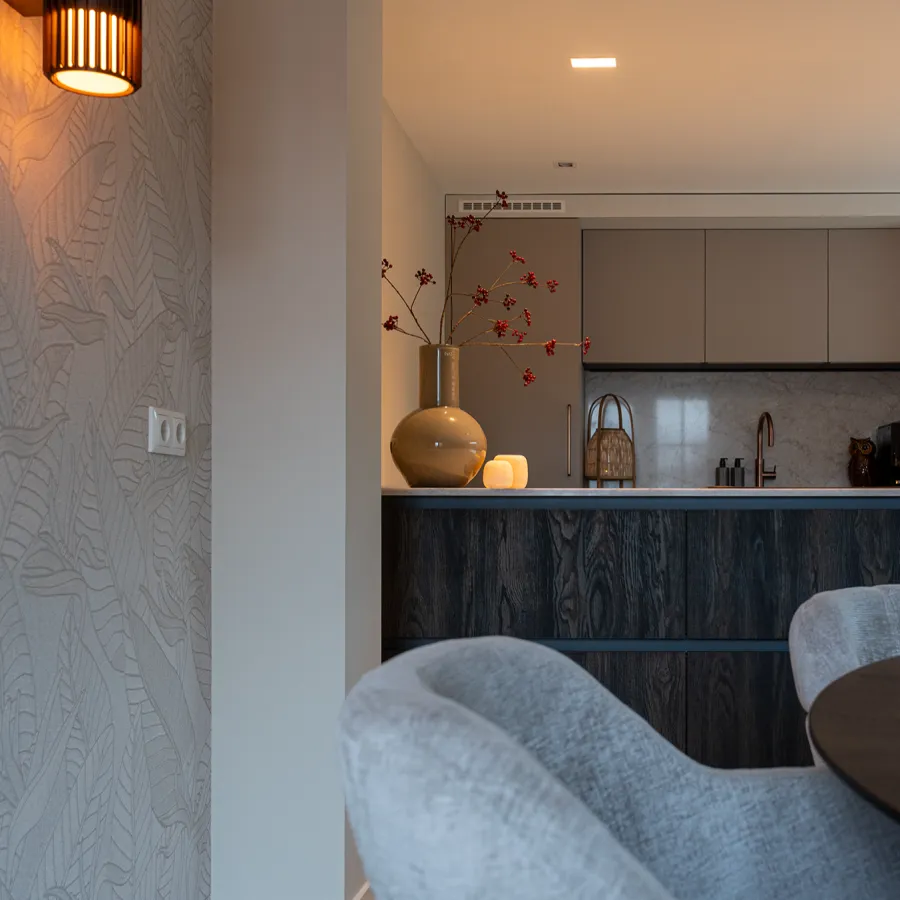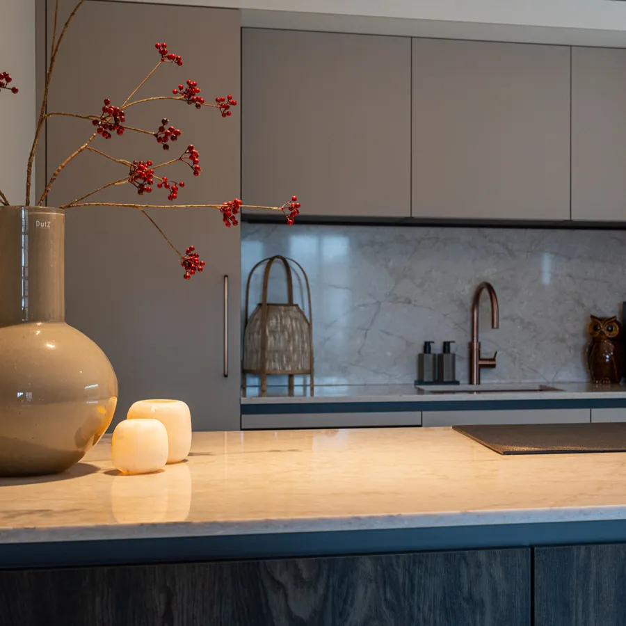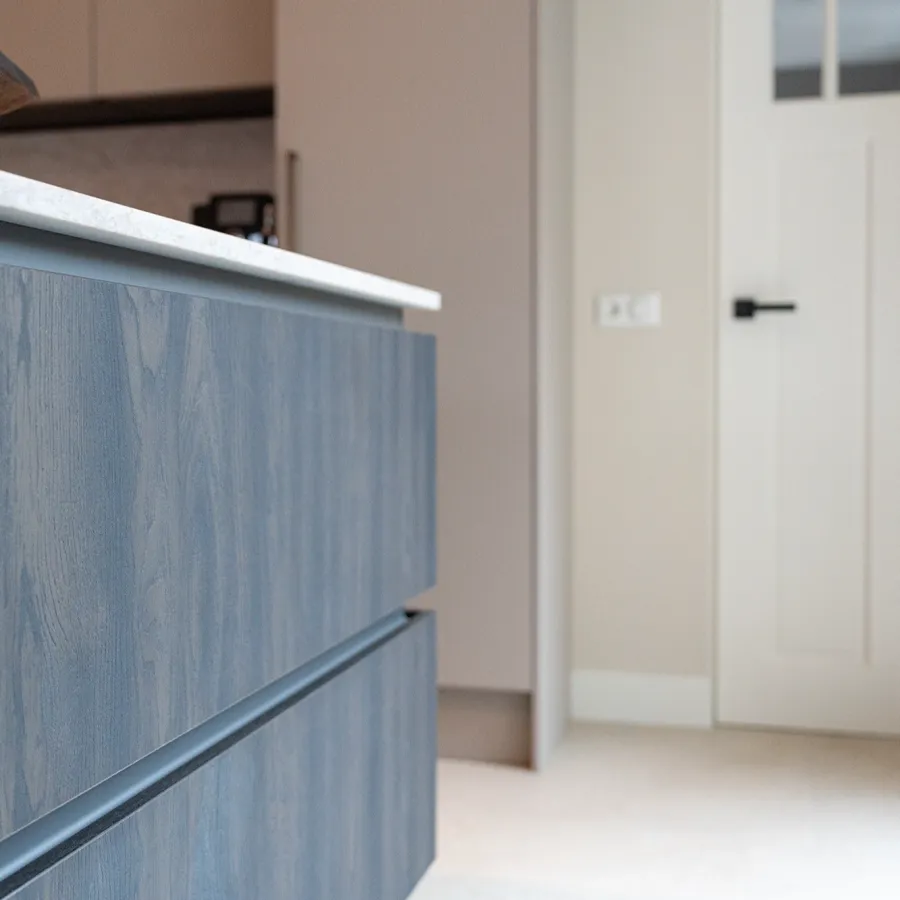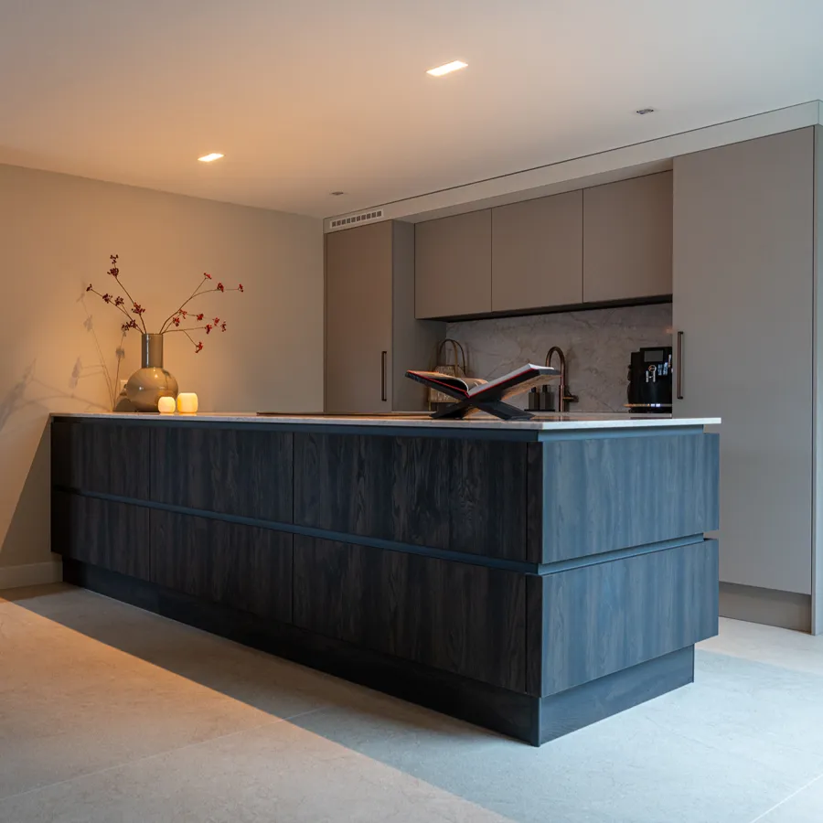 Het schiereiland is uitgevoerd in Burnt Wood decor, dat een natuurlijke uitstraling geeft. De kastenwand met koffienis is uitgevoerd in Dark Powder en biedt veel opbergruimte. Zowel het schiereiland als de koffienis hebben een Glencoe gepolijst werkblad van composiet. Bij de nis is ook de achterwand hiermee bekleed. De keuken is afgewerkt met de subtiele greeplijst Art Pepper.